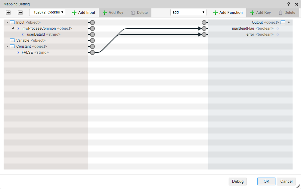 今回は、メール送信を利用しないので、定数設定に「false」を設定した定数を用意し、終了タスクの出力、mailSendFlagerrorにマッピングします。