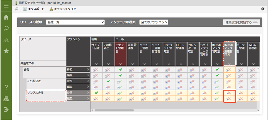下記の例では、「サンプル会社」に対して「IM共通マスタ運用管理者」ロールに参照・編集権限が付与されていません(会社の参照・編集(行)とロール(列)が交差するセルが (禁止)と表示)。この状態では、「IM共通マスタ運用管理者」ロールは「サンプル会社」のユーザや組織に関する操作を行うことができません。そのため、「IM共通マスタ運用管理者」ロールに参照・編集の権限を付与する必要があります。