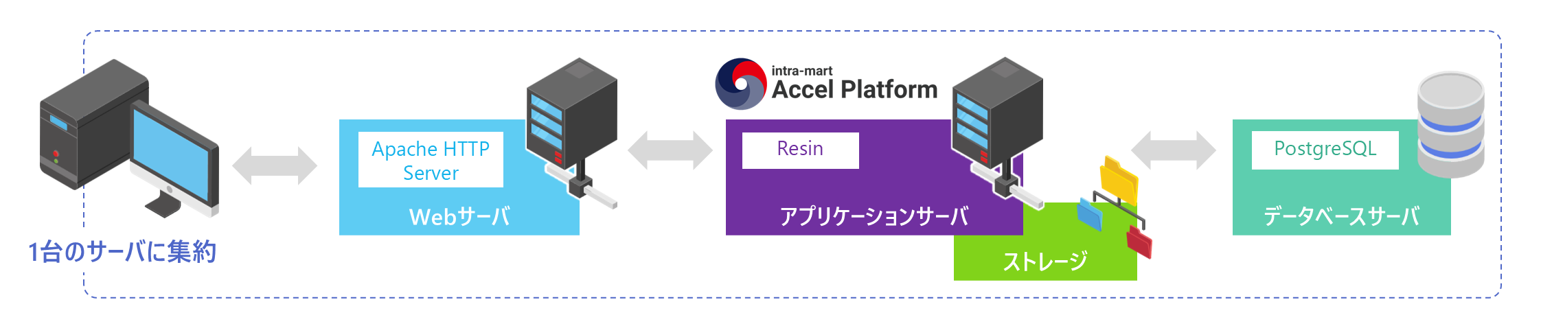 本ガイドでは、サーバ1台にアプリケーションサーバやデータベースを同居させる、単一サーバによるスタンドアロン構成とします。