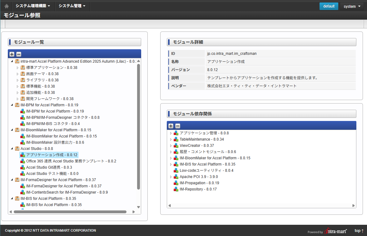 テナント環境セットアップ後は、システム管理画面の「モジュール参照」画面からも確認が可能です。