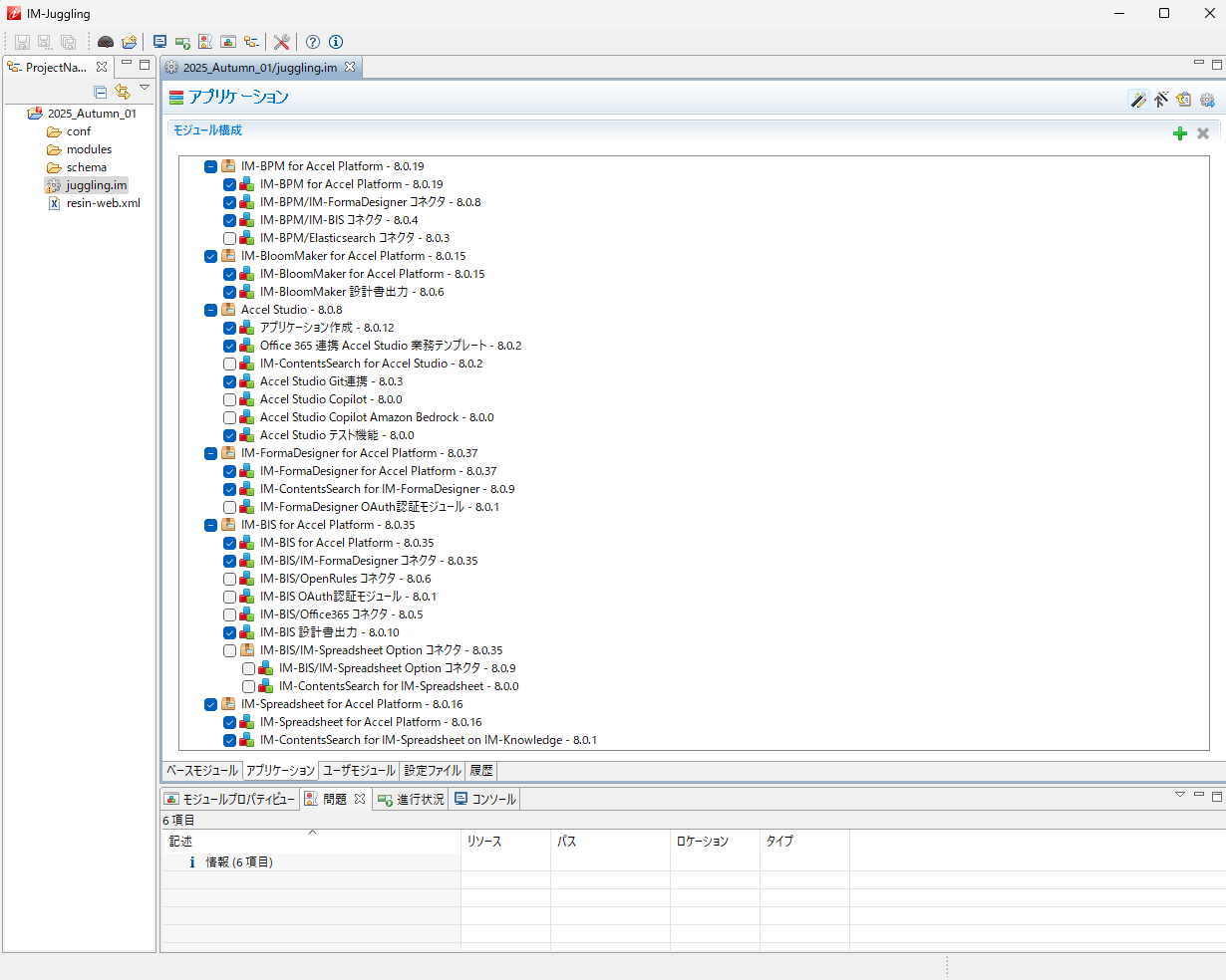 IM-Jugglingは、intra-mart向けのWAR作成・管理ツールです。業務システム基盤に必要なモジュール、設定、静的ファイルをまとめてパッケージ化(WAR/ZIP)し、デプロイ準備を自動化します。