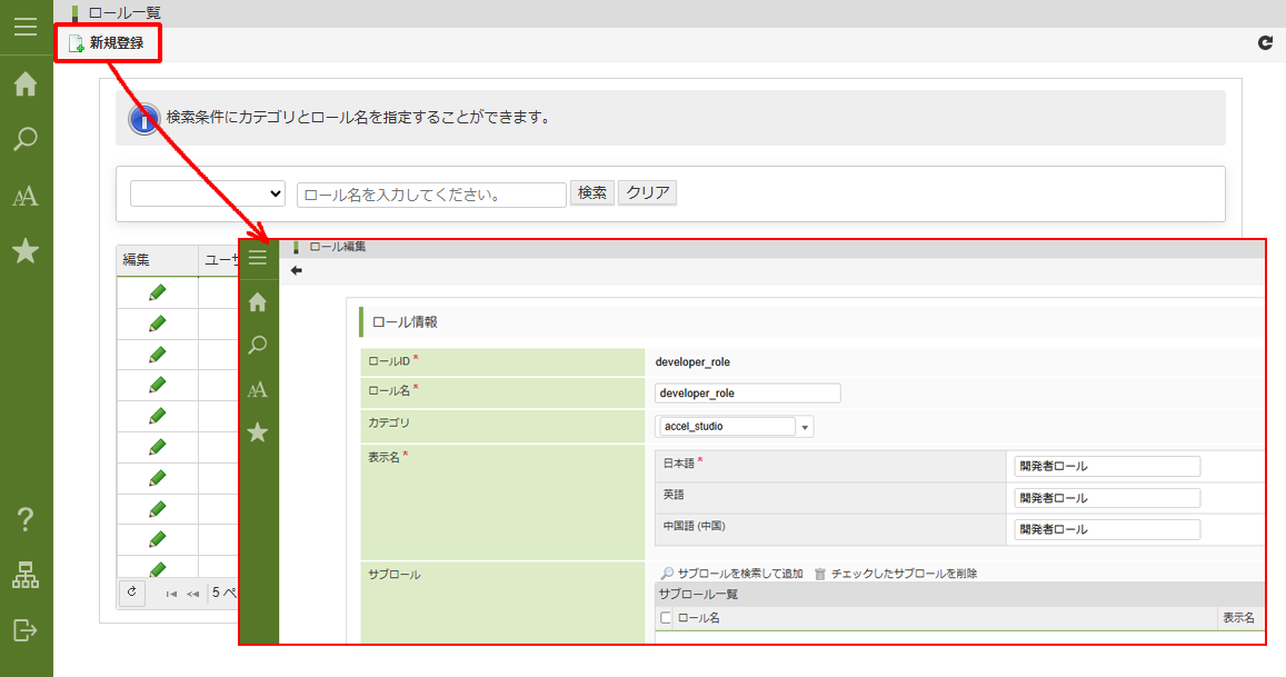 - 「新規登録」をクリックして、「ロール編集」画面を表示し、必要事項を入力してロールを作成する