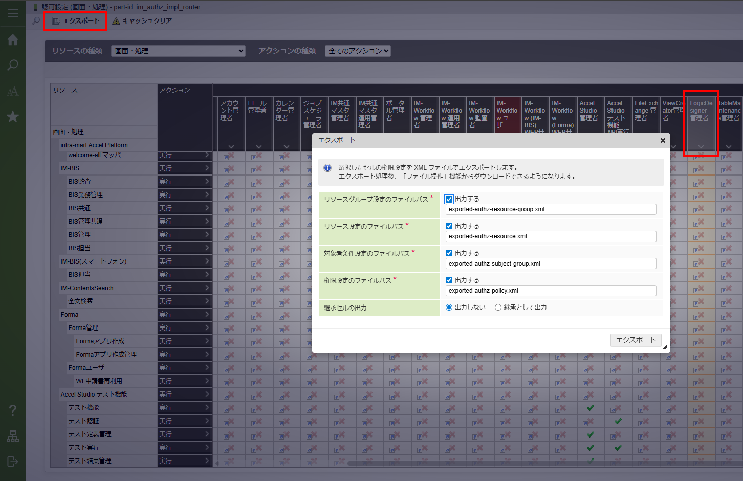 エクスポート機能は、認可設定画面から実行可能です。エクスポートしたいセルを選択(Shiftキー+クリック、または上部の管理者名クリックで複数選択可)し、「エクスポート」をクリックすると確認ダイアログが表示されますので、任意の場所に出力してください。
