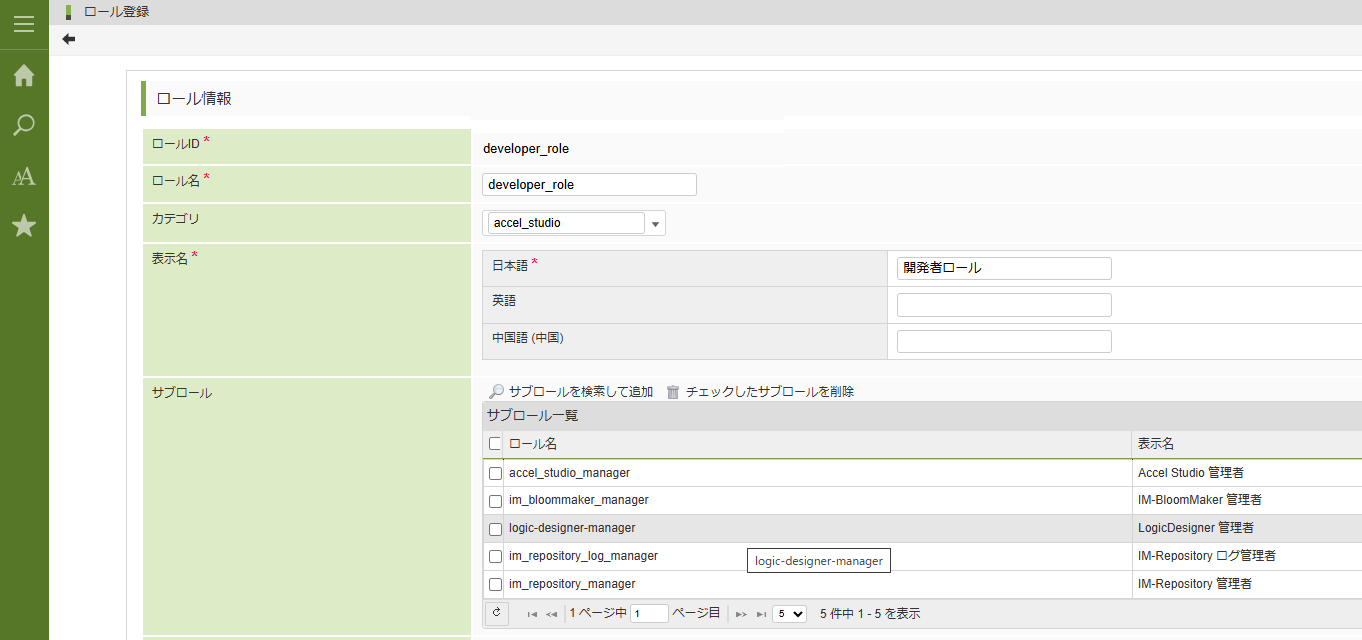 | サブロール | ロールにサブロールを追加したい場合に「サブロールを検索して追加」をクリックして追加 | ||