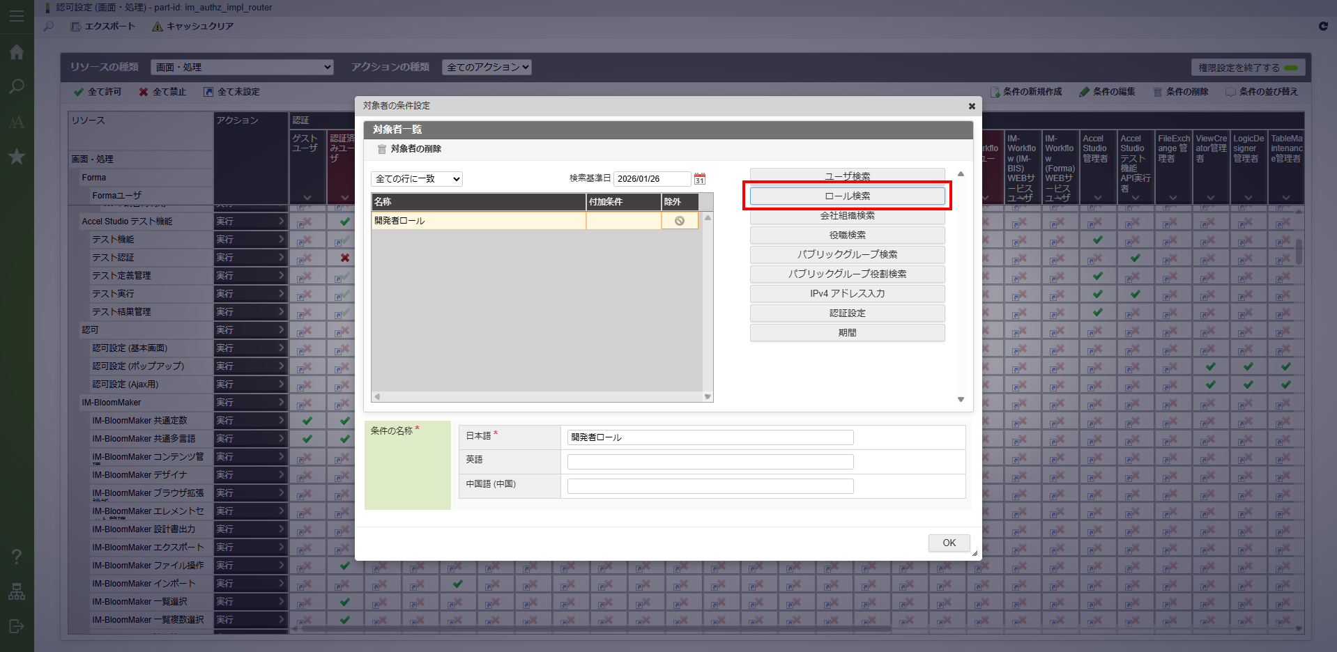 次に、認可設定画面で作成した新規ロールを「対象者条件(サブジェクト)」に追加します。