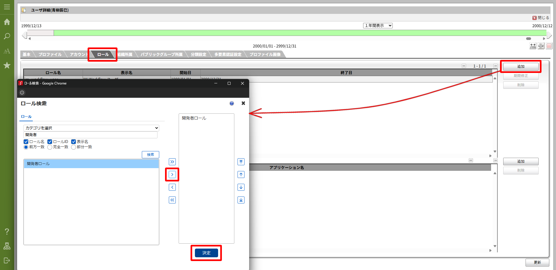 ユーザ詳細画面の「ロール」タブから「追加」をクリックし、ロール検索画面で作成したロールを付与します。
