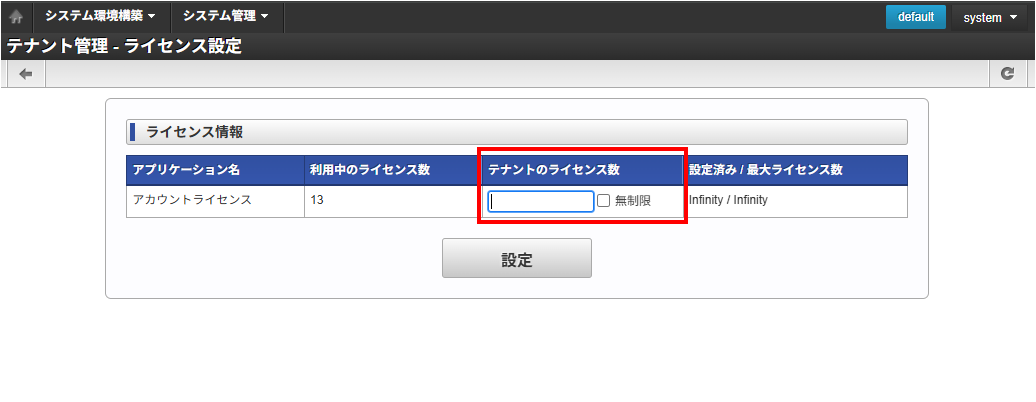 - 管理者でログイン: システム管理者ホーム → システム環境構築 → テナント管理 を開き、「ライセンス設定」ボタンをクリック