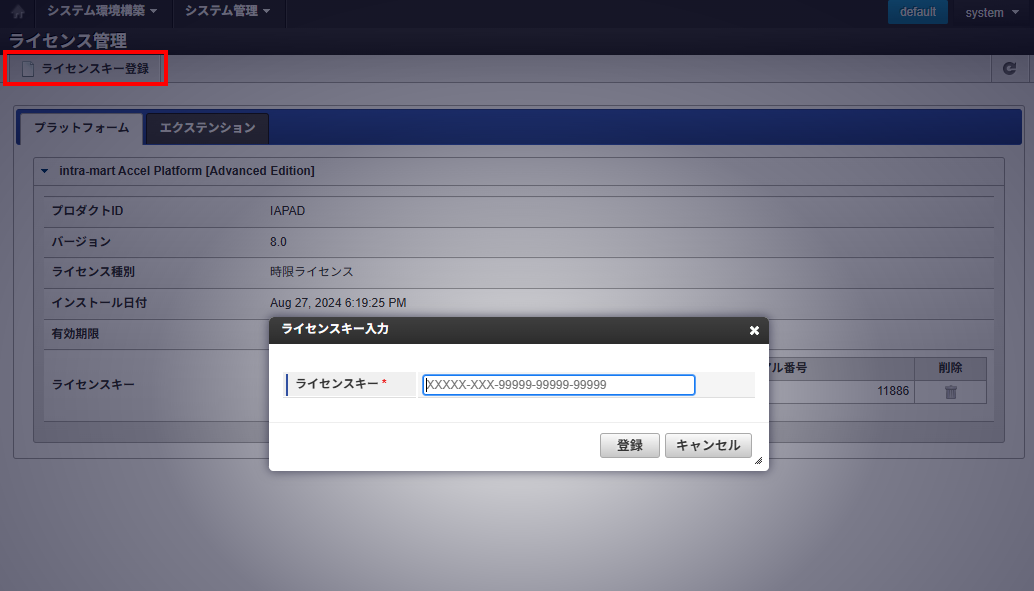 - 管理者でログイン: システム管理者ホーム → システム環境構築 → ライセンス管理 を開き、「ライセンスキー登録(追加)」ボタンをクリック