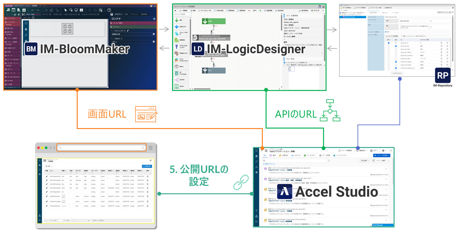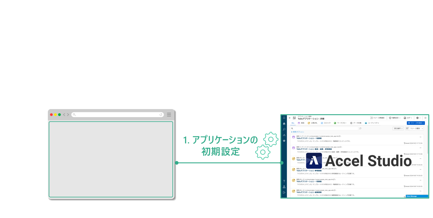 Accel Studioから画面やロジックのルーティング定義を設定します。 新しく作成した画面コンテンツやロジックフローに対して、ルーティング定義を設定し、公開用のURLを作成します。認可設定を行うことで、外部から作成したアプリケーションにアクセスできるようになります。
