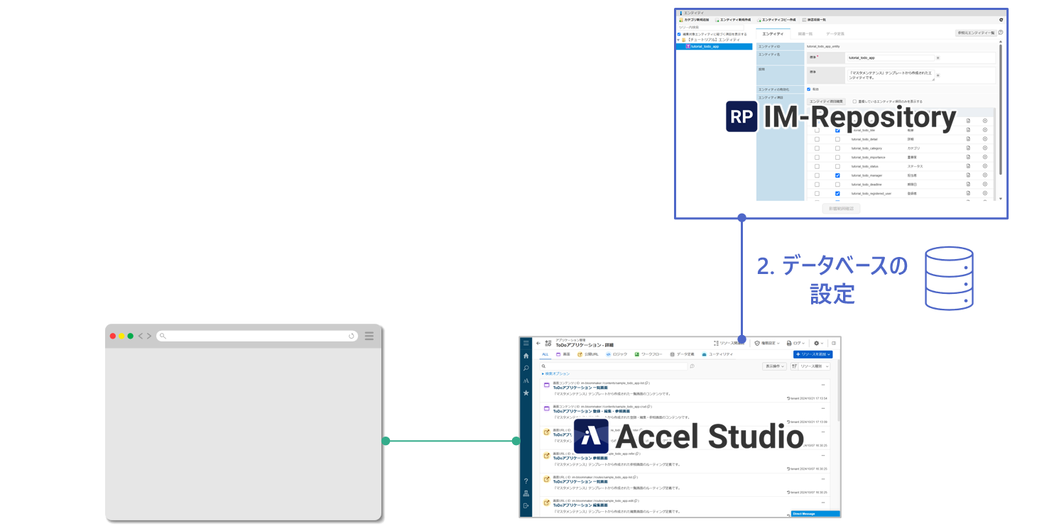 Accel StudioからIM-Repositoryの操作画面を表示し、データベースの初期設定を行います。 エンティティや辞書項目の設定に加え、必要に応じてサブエンティティの指定を行うことで、アプリケーションにデータ定義を追加します。