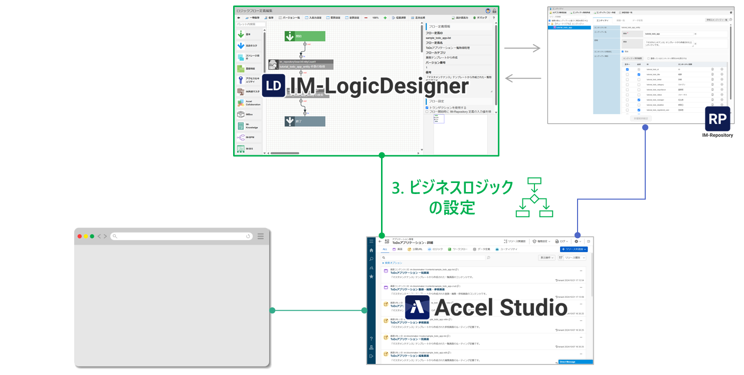 Accel StudioからIM-LogicDesignerの操作画面を表示し、アプリケーションに必要なビジネスロジックを設定します。 入出力値・変数・定数を定義し、エレメントの配置やマッピング設定によってロジックフローを構築します。これにより、処理とデータベースとの連携が可能になります。