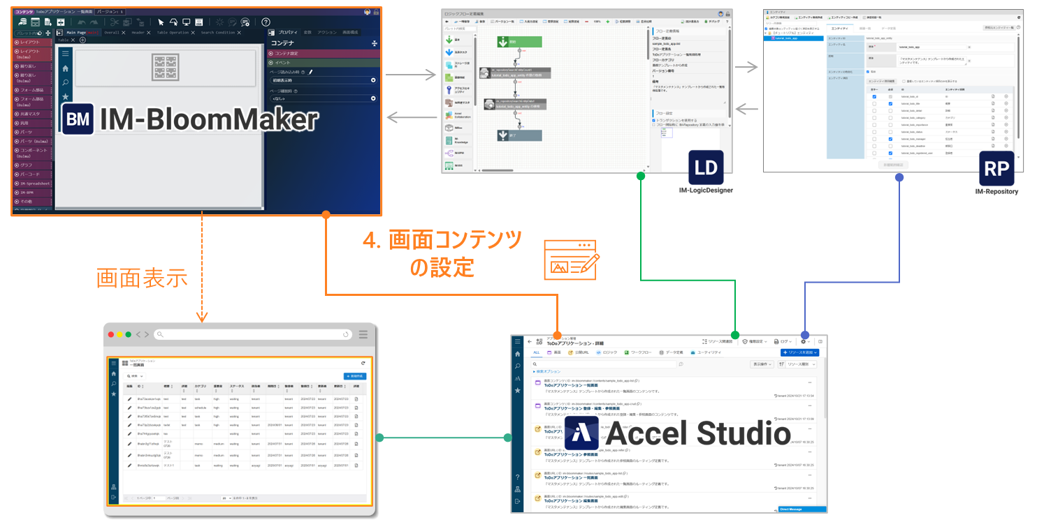 Accel StudioからIM-BloomMakerの操作画面を表示し、アプリケーションの画面コンテンツを作成します。 エレメントを配置して画面をデザインし、変数やアクションなどの処理を設定します。これにより、画面と処理との連携が可能になります。