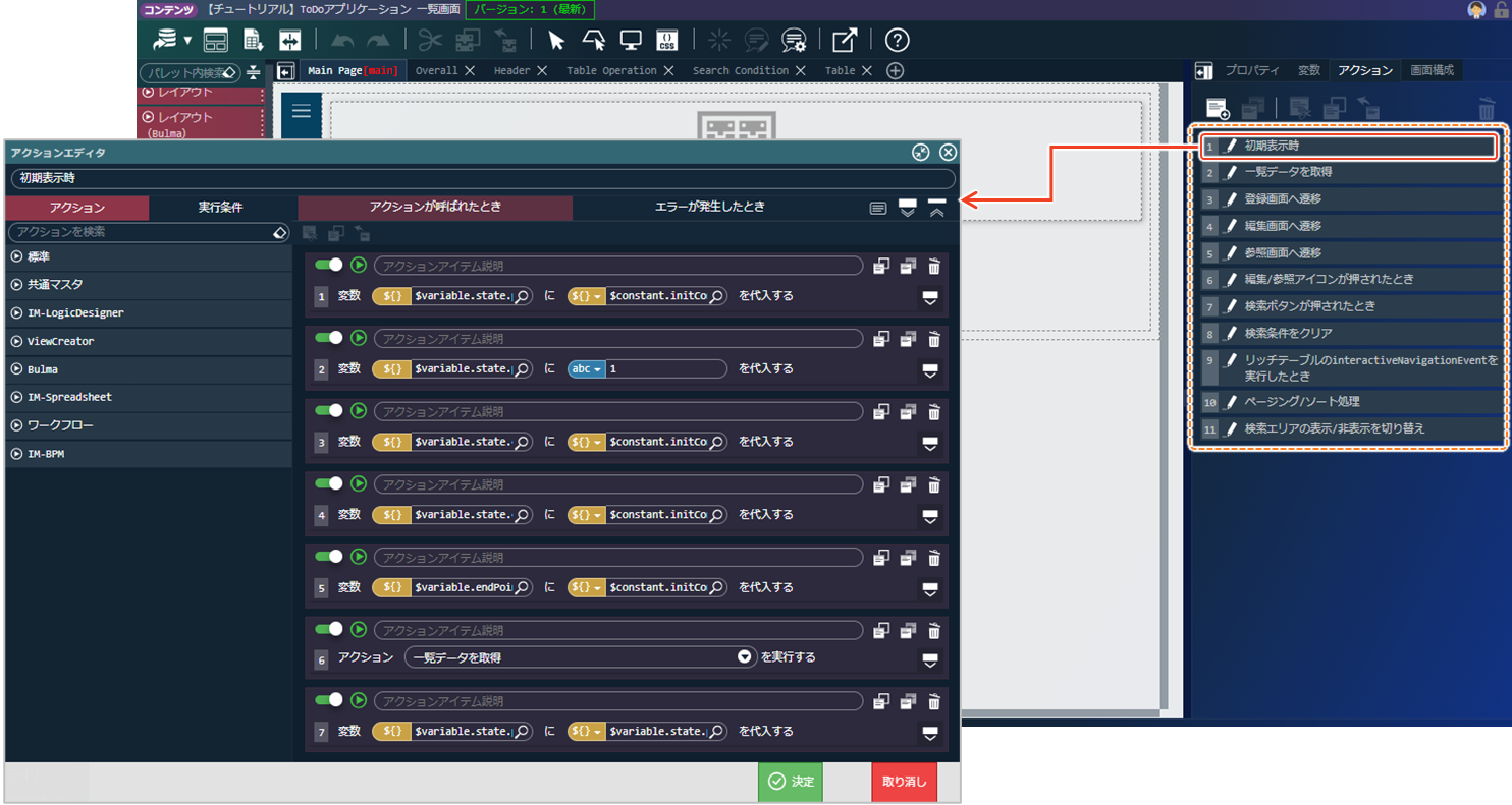 アクション設定とは、画面上でユーザの操作やイベントが発生した際に、あらかじめ定義した処理を自動的に実行するための仕組みです。たとえば、ボタンをクリックしたときに確認メッセージを表示して別ページへ遷移させたり、入力内容に誤りがある場合にエラーメッセージを表示したりできます。