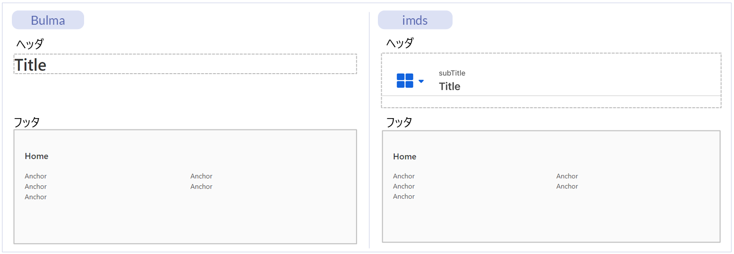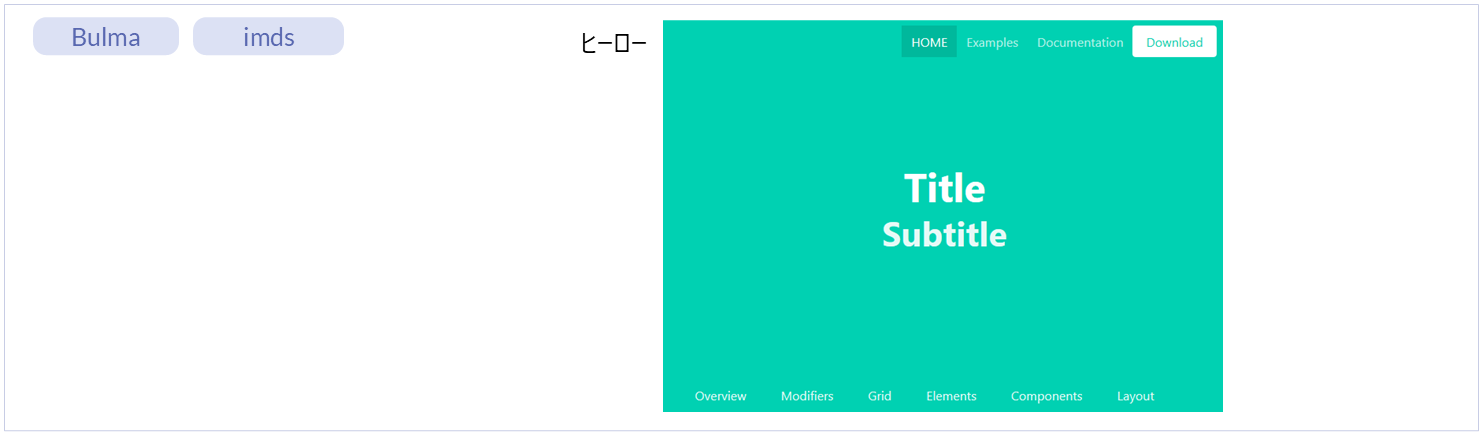 レイアウト(imds)ページの上部に表示されるエレメントです。 フッタ ー ー ● ● レイアウト(Bulma)
