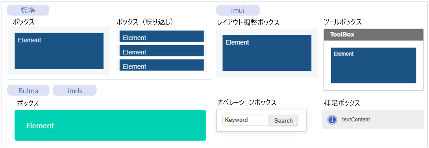 レイアウト(imds)配下をグループ化するエレメントです。Bulma/imdsでは、箱のように見せるために使用します。 ボックス(繰り返し) ● ー ー ー 繰り返し 「ボックス」エレメントを繰り返し配置するエレメントです。 レイアウト調整ボックス ー ● ー ー レイアウト(imui) 配下のエレメントの位置を調整するためのエレメントです。 オペレーションボックス ー ● ー ー レイアウト(imui) 配下のテキストボックスやボタンを囲むためのエレメントです。 ツールボックス ー ● ー ー レイアウト(imui) 配下のエレメントをひとまとめにするためのエレメントです。 補足ボックス ー ● ー ー レイアウト(imui) 画面の操作方法や注意事項を表示するためのエレメントです。 コラムコンテンツ種別「imui」の「ボックス」エレメントは、用途に応じて次のように使い分けることができます。