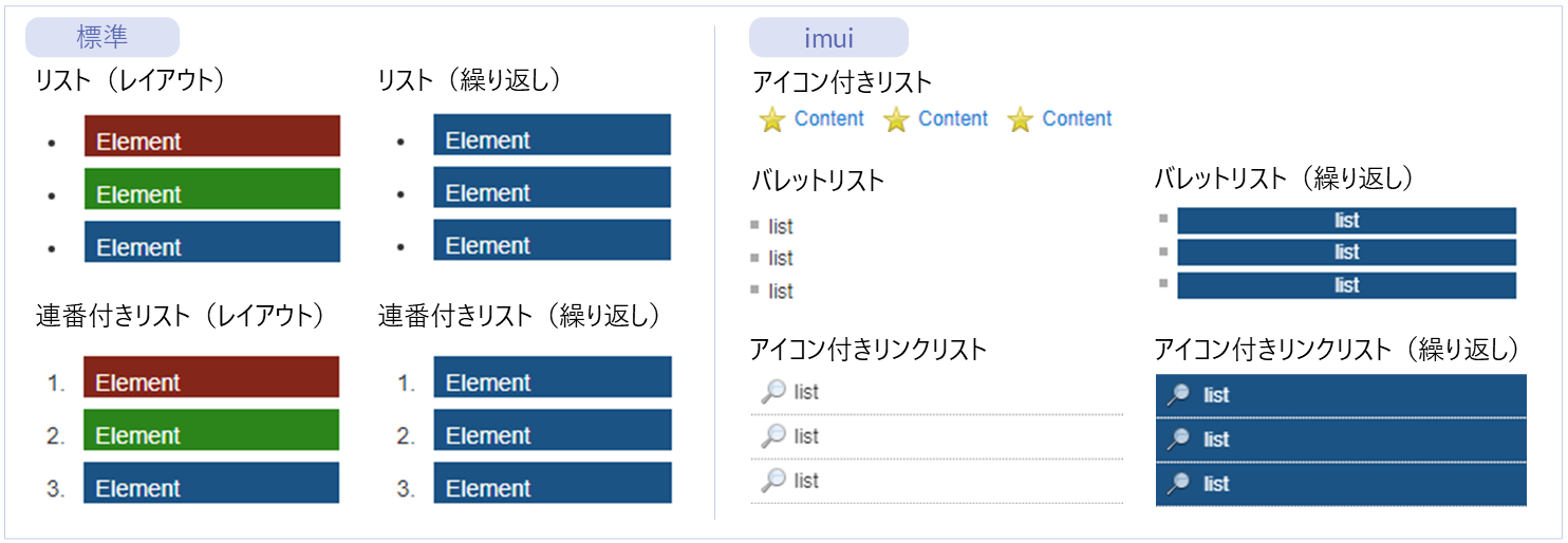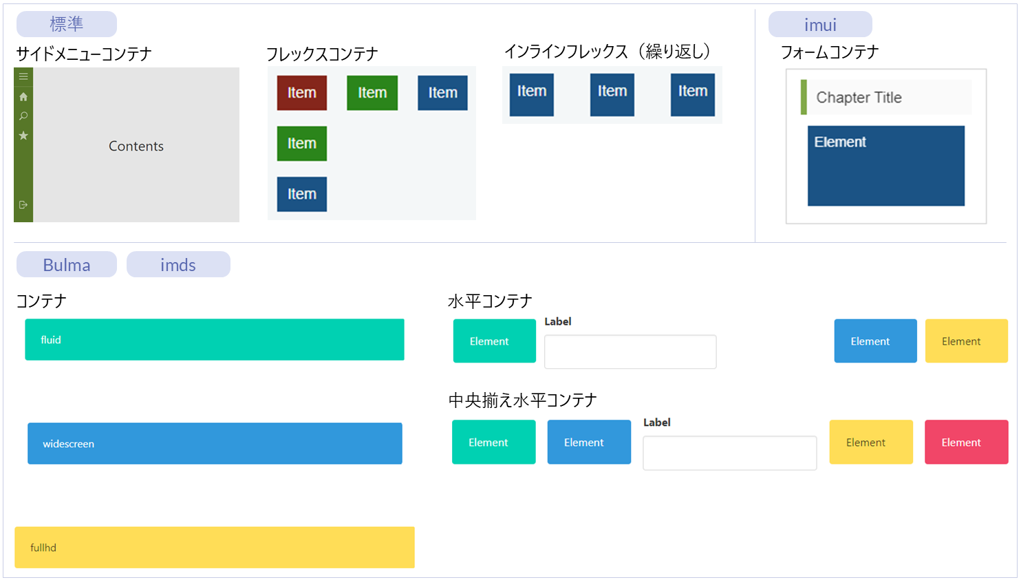 (繰り返し)● ー ー ー 繰り返し 横並びにエレメントを繰り返し配置するエレメントです。 フォームコンテナ ー ● ー ー レイアウト(imui) 親エレメントの横幅から、指定した割合の枠線を表示するエレメントです。 コンテナ ー ー ● ● レイアウト(Bulma)