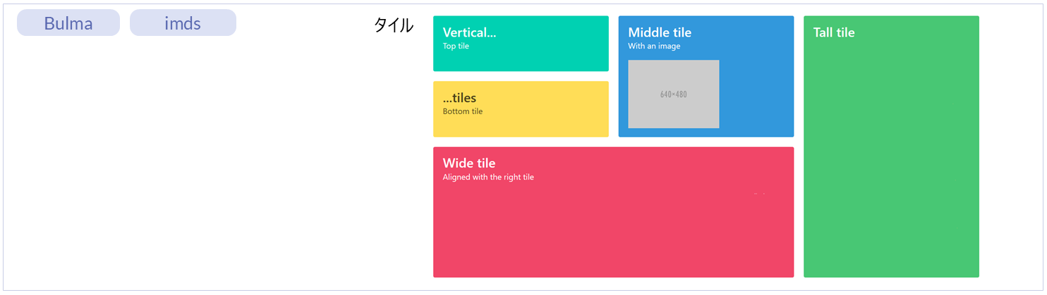 名称 標準 imui Bulma imds カテゴリ 用途 タイル ー ー ● ● レイアウト(Bulma)