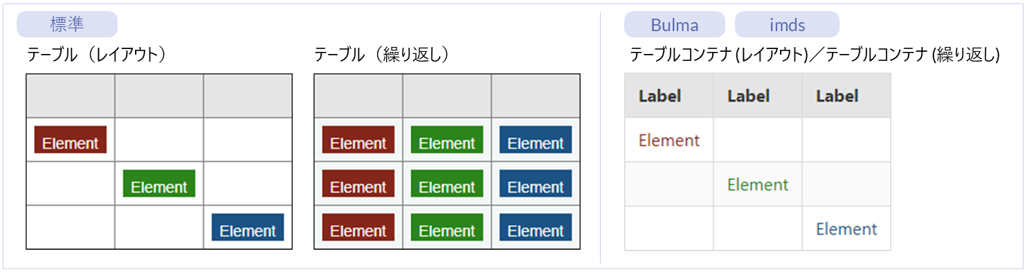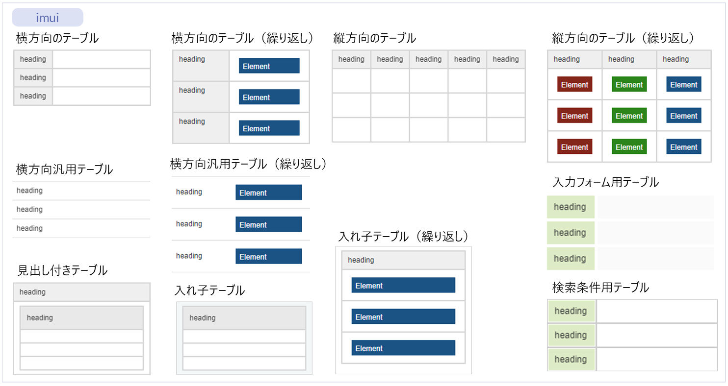 名称 標準 imui Bulma imds カテゴリ 用途 テーブル(レイアウト) ● ー ー ー レイアウト 表形式でエレメントを配置するエレメントです。 テーブル(繰り返し) ● ー ー ー 繰り返し 表形式でエレメントを繰り返し配置するエレメントです。 テーブルコンテナ ー ー ● ● レイアウト(Bulma)