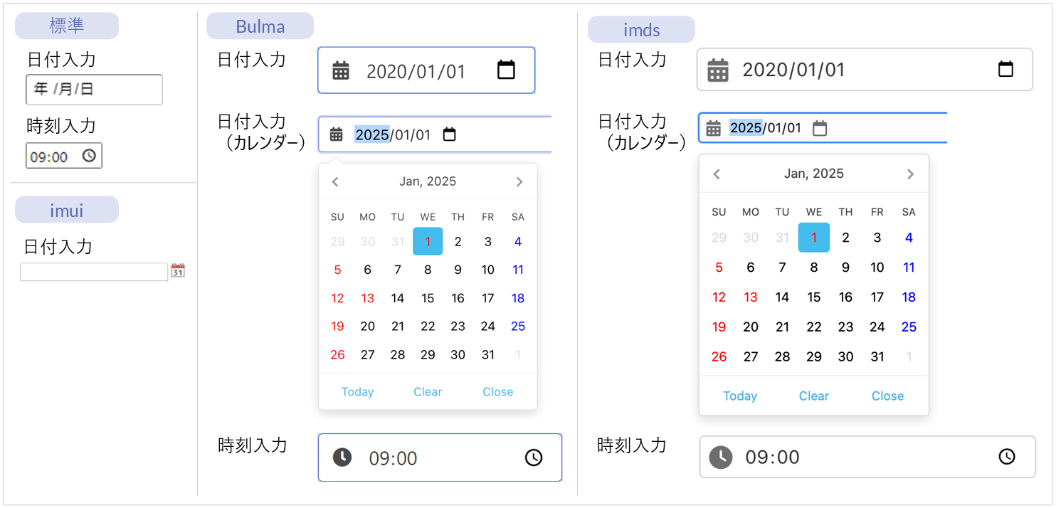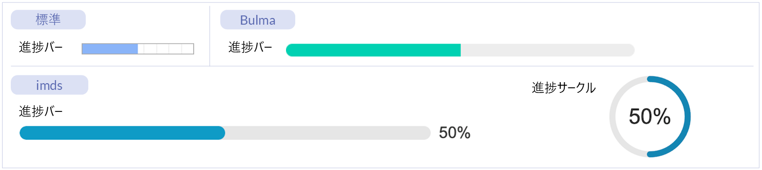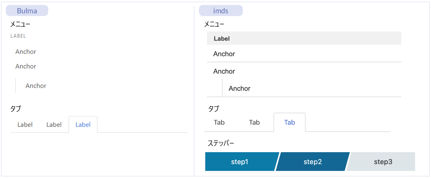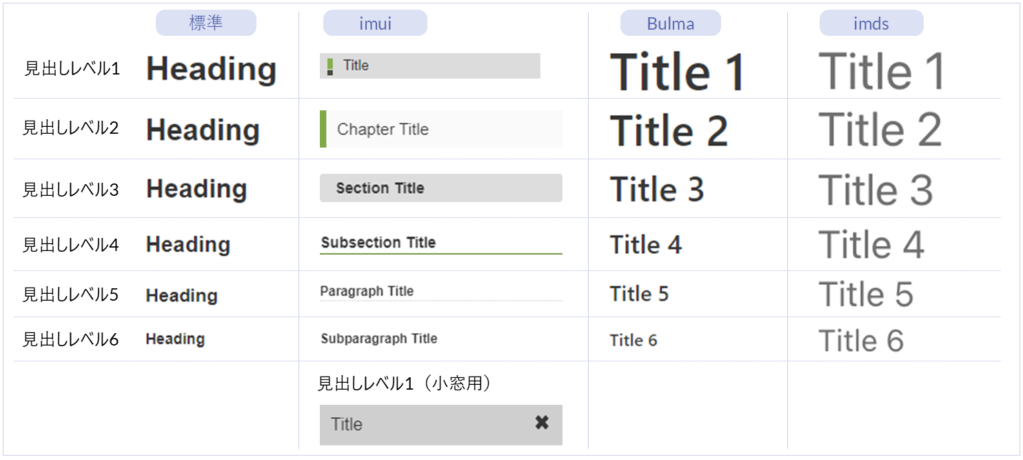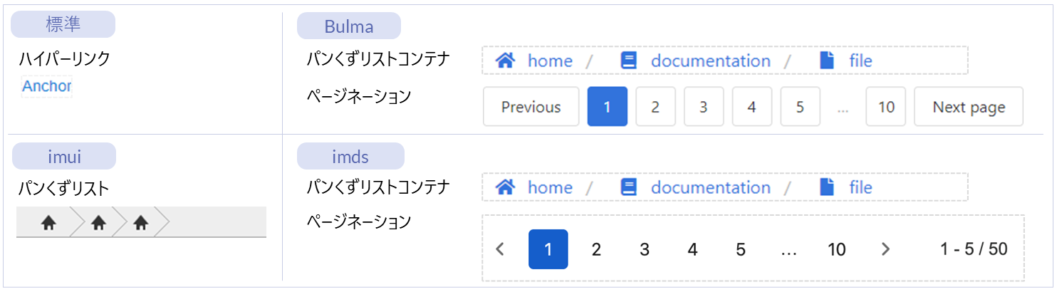 | 名称 | 標準 | imui | Bulma | imds | カテゴリ | 用途 |