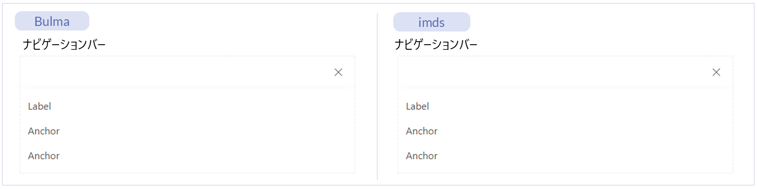 コンポーネント(imds)ドロップダウンメニューに配置する、配下にエレメントを配置するためのエレメントです。 ドロップダウン水平罫線アイテム ー ー ● ● コンポーネント(Bulma)
