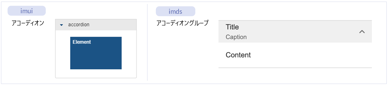 コンテンツ種別(imui・Bulma・imds)の部品または標準部品によってデザインの方向性が異なるため、利用可能なエレメントの種類も変わります。コンテンツ種別の部品は、それぞれの種別で専用のエレメントが用意されています。一方で、標準部品はintra-mart Accel Platformで汎用的に利用できるエレメントが揃っています。コンテンツ種別の違いについては、「画面コンテンツの作成 > コンテンツ種別について」を参照してください。