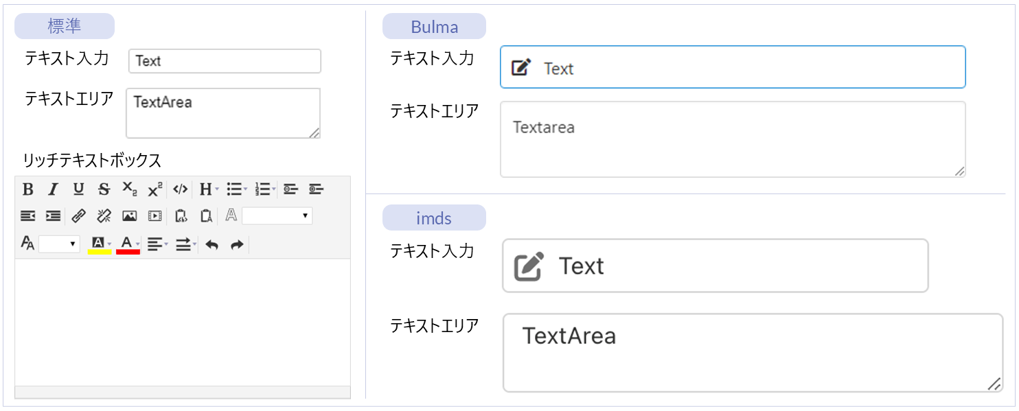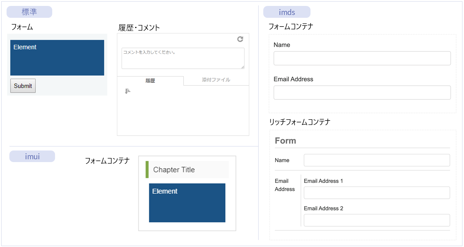 名称 標準 imui Bulma imds カテゴリ 用途 フォーム ● ー ー ー フォーム部品 入力・送信フォームを作成するためのエレメントです。 フォームコンテナ ー ● ー ー フォーム部品(imui) 親エレメントの横幅から、指定した割合の枠線を表示するエレメントです。 フォームコンテナ ー ー ー ● フォーム部品(imds) 「フィールドグループ」を適切な間隔で配置するためのエレメントです。 リッチフォームコンテナ ー ー ー ● フォーム部品(imds) 見出しの付いた複数項目のフォームを作成できます。 履歴・コメント ● ー ー ー フォーム部品 コメントや操作履歴などを表示・記録するエレメントです。 フィールド