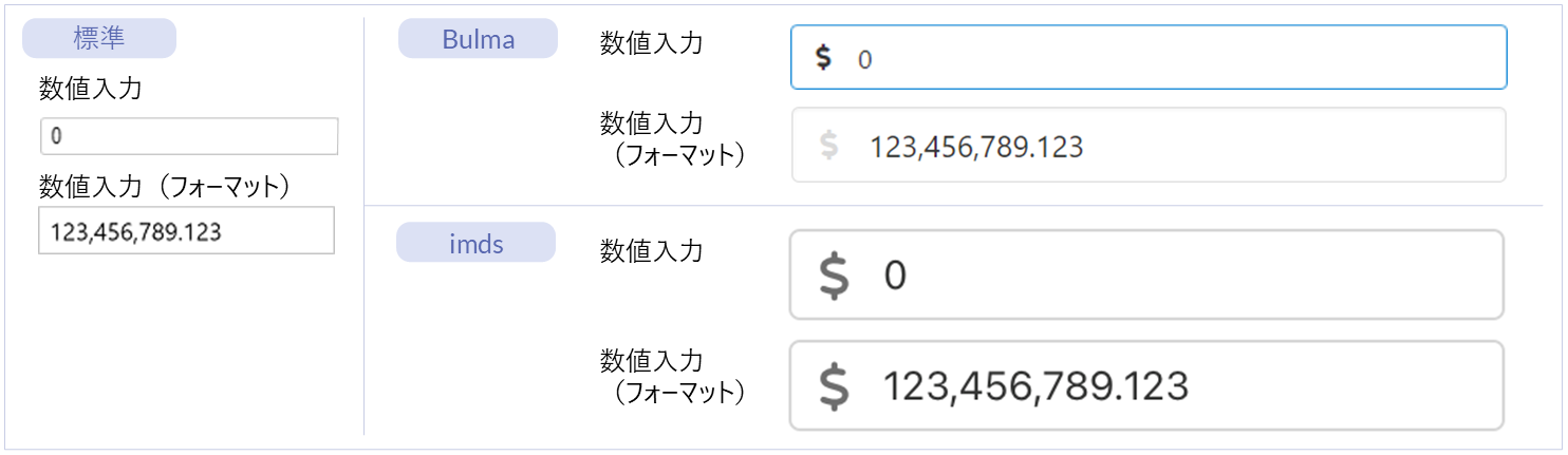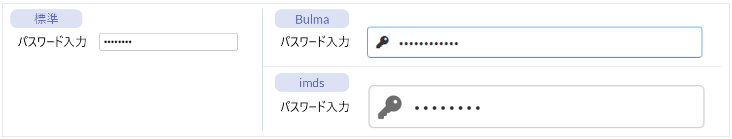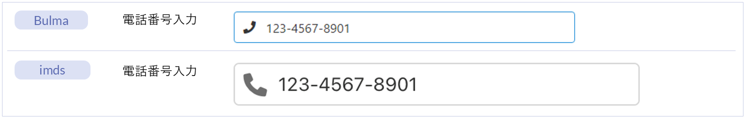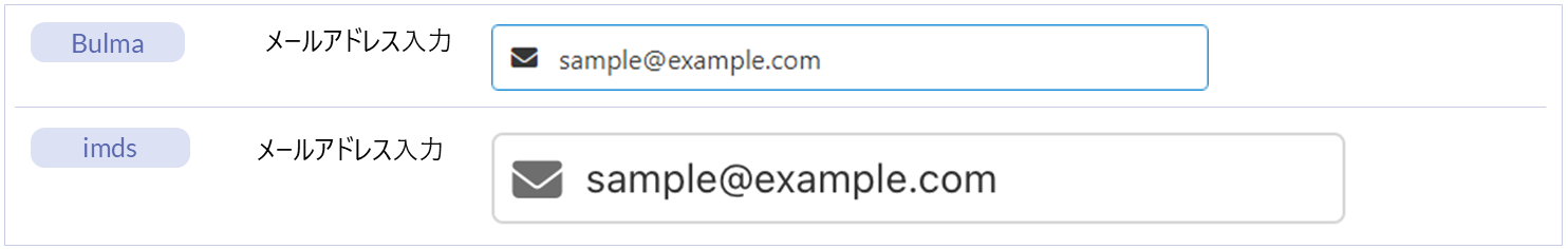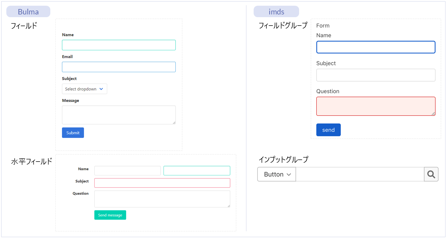 名称 標準 imui Bulma imds カテゴリ 用途 フィールド ー ー ● ー フォーム部品(Bulma) 入力・送信フォームを作成するためのエレメントです。項目同士の配置を指定できるエレメントです。 水平フィールド ー ー ● ー フォーム部品(Bulma) 入力・送信フォームを作成するためのエレメントです。項目を水平方向に配置できるエレメントです。 フィールドグループ ー ー ー ● フォーム部品(imds) 複数の「フィールド」エレメントをグループ化して配置するためのエレメントです。項目同士の配置を指定できるエレメントです。 インプットグループ ー ー ー ● フォーム部品(imds) 配下のエレメントをグループ化して表示するエレメントです。「フィールド」エレメントの配下に配置します。 エレメント配置アイテム ー ー ● ● フォーム部品(Bulma)