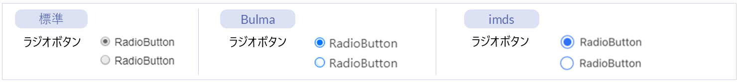 名称 標準 imui Bulma imds カテゴリ 用途 ラジオボタン ● ー ● ● フォーム部品