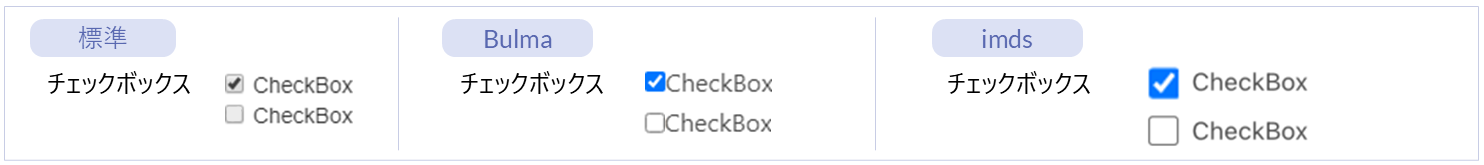 名称 標準 imui Bulma imds カテゴリ 用途 チェックボックス ● ー ● ● フォーム部品