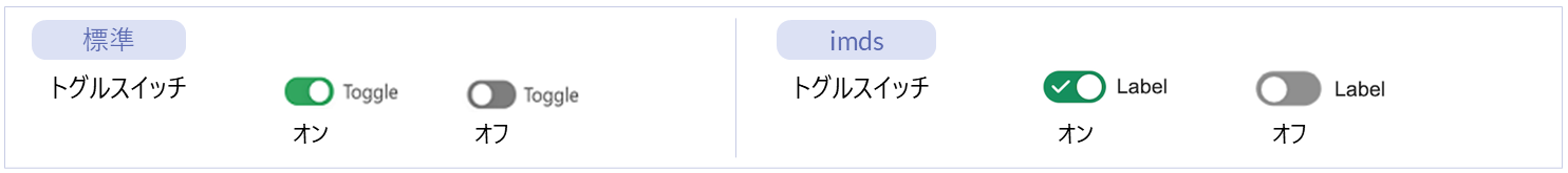 名称 標準 imui Bulma imds カテゴリ 用途 トグルスイッチ ● ー ー ● フォーム部品