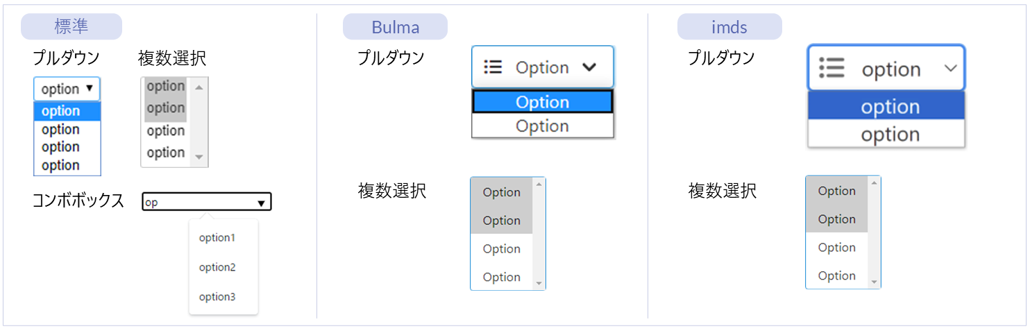 名称 標準 imui Bulma imds カテゴリ 用途 プルダウン ● ー ● ● フォーム部品