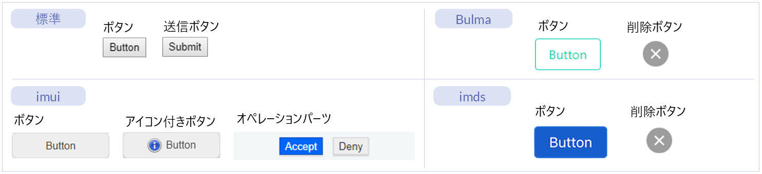 名称 標準 imui Bulma imds カテゴリ 用途 ボタン ● ー ● ● フォーム部品