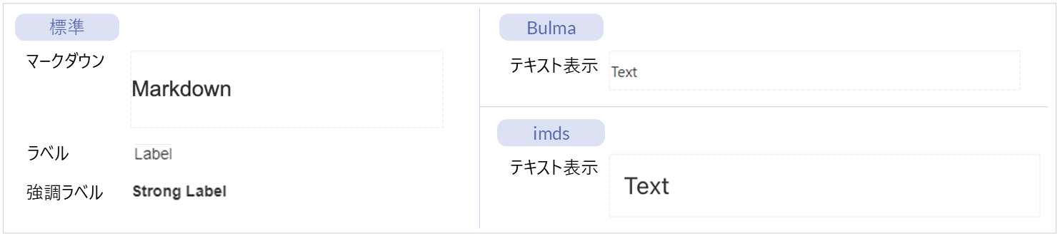 名称 標準 imui Bulma imds カテゴリ 用途 マークダウン ● ー ー ー 汎用 マークダウン形式で入力した内容を表示するエレメントです。 ラベル ● ー ー ー 汎用 テキストラベルを表示するエレメントです。 強調ラベル ● ー ー ー 汎用 強調テキストラベルを表示するエレメントです。 テキスト表示 ー ー ● ● フォーム部品(Bulma)