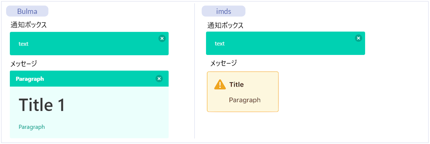 名称 標準 imui Bulma imds カテゴリ 用途 通知ボックス ー ー ● ● パーツ(Bulma)