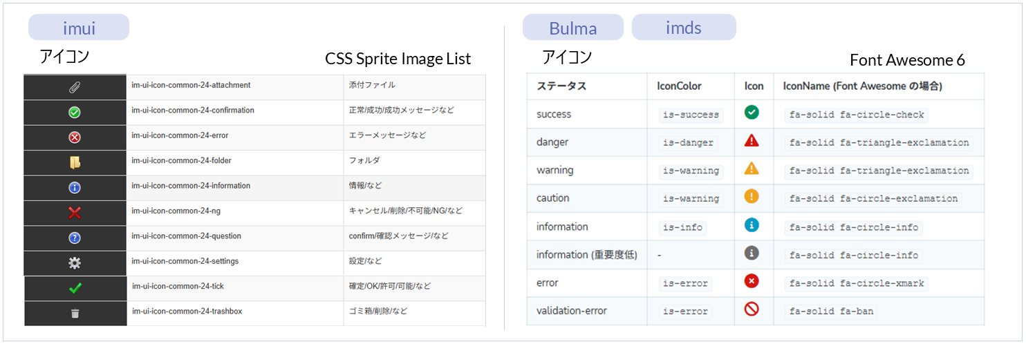名称 標準 imui Bulma imds カテゴリ 用途 アイコン ー ● ー ー パーツ(imui) アイコンを表示するエレメントです。CSS Sprite Image Listのクラスを指定します。 アイコン ー ー ● ● パーツ(Bulma)