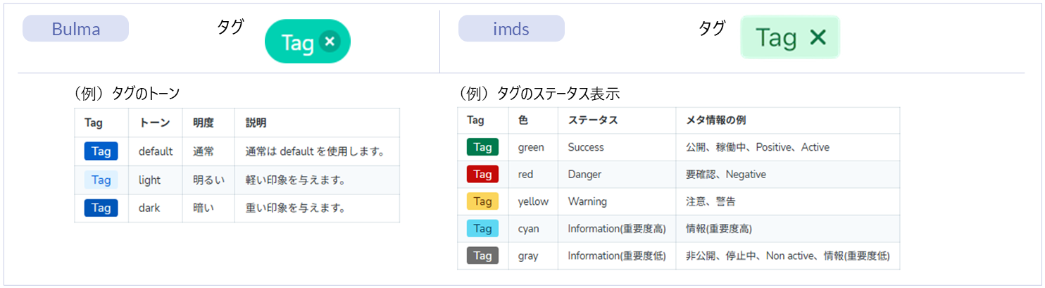 名称 標準 imui Bulma imds カテゴリ 用途 タグ ー ー ● ● パーツ(Bulma)