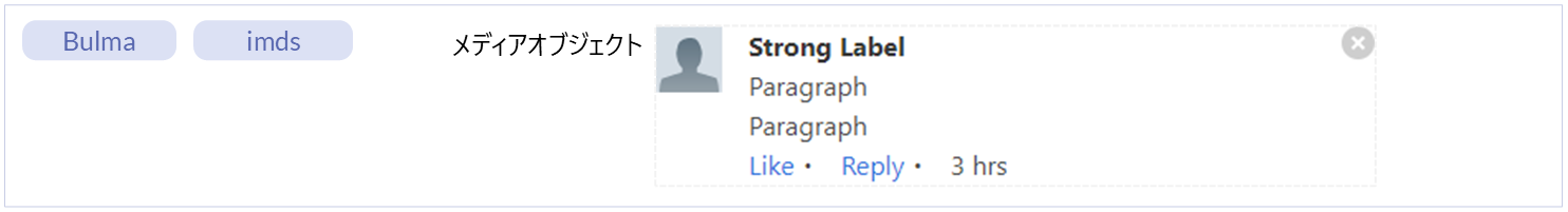 パーツ(imds)通知用のボックスを表示するエレメントです。 メッセージ ー ー ● ● コンポーネント(Bulma)