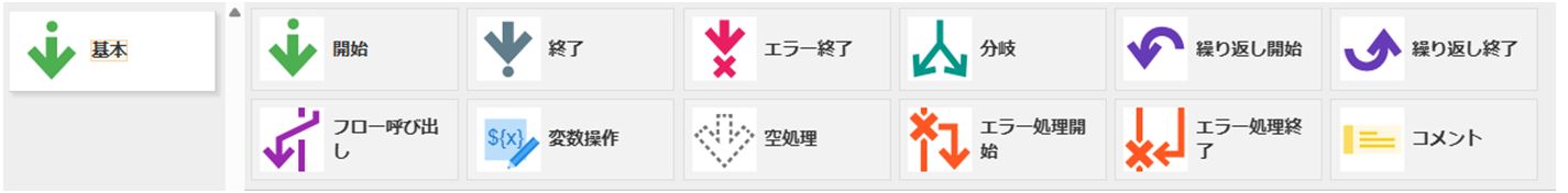 | 繰り返し開始/終了 | 処理の繰り返しを開始・終了する制御要素です。繰り返しの条件や回数を設定します。開始と終了の要素をセットで使用します。 |