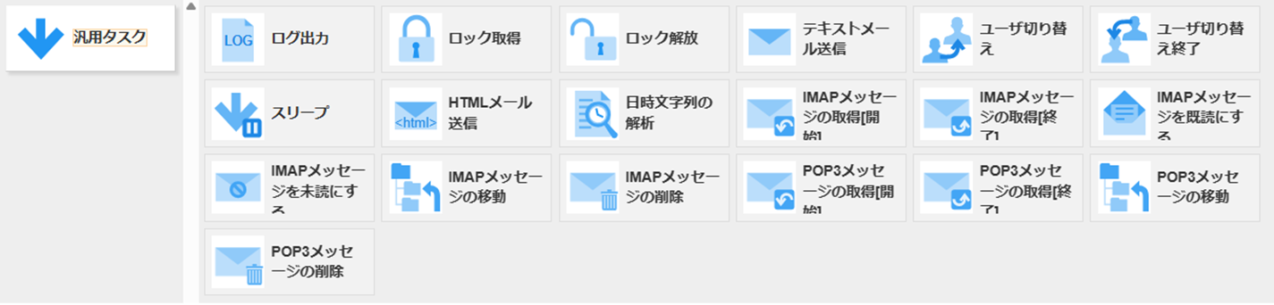 | ユーザ切り替え/ユーザ切り替え終了 | 処理の一部を別ユーザの権限で実行したいときに使用します。必ず「ユーザ切り替え終了」タスクとセットで使用してください。 |