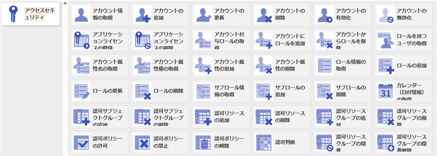 ユーザ管理や認可に関わる共通処理を行う場合に利用します。パレットの「アクセスセキュリティ」メニューから選択できます。