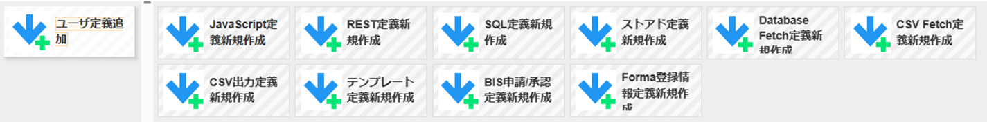 | Database/CSV Fetch定義新規作成 | データベース上に格納されている大量のデータまたはCSVファイルの大量のレコードを効率的に取得し、処理したいときに使用します。 |