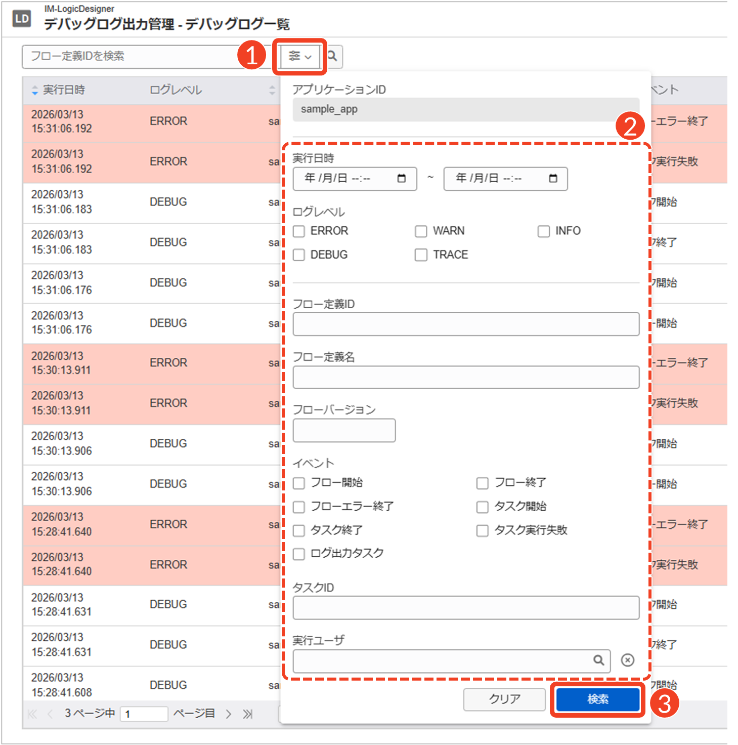 デバッグログの一覧を検索する
