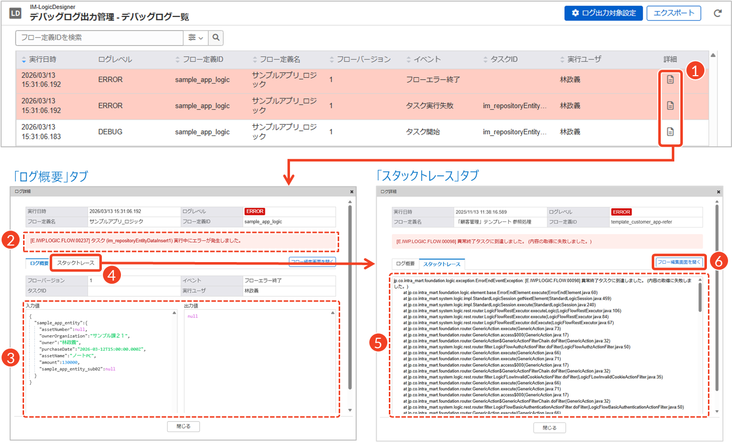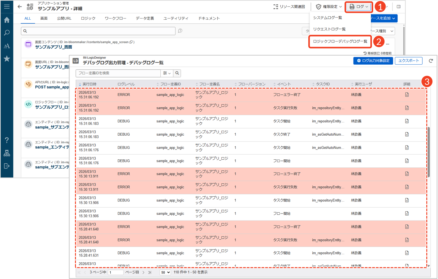「アプリケーション管理」画面から確認できるログは、データベースに出力される「デバッグログ」(imld_debug_log)の内容が表示されます。詳細なログ項目や仕様については、「IM-LogicDesigner仕様書 - 4.7.1. デバッグログ出力先のテーブル構成」を参照してください。