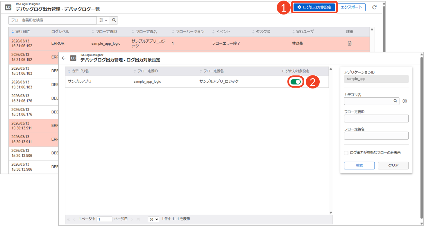 特定のアプリケーションに紐づくロジックフロー定義を一覧で表示し、それらのデバッグログの出力設定をまとめて変更できます。