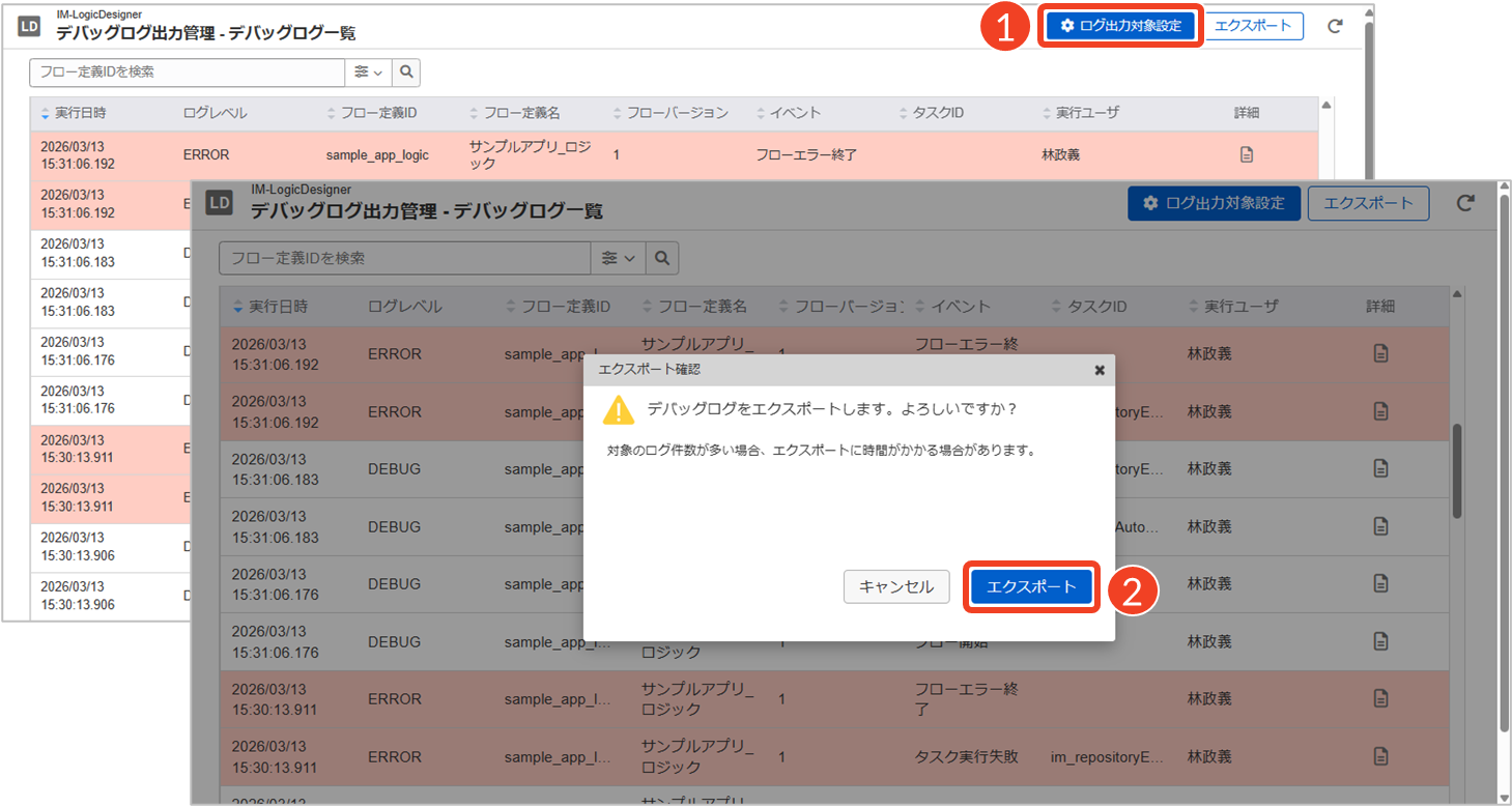 大量のデバッグログをエクスポートする場合、処理に時間がかかることがあります。その場合は、検索機能を利用して条件を絞り、複数回に分けてエクスポートしてください。検索機能については、上記「デバッグログの一覧を検索する」を参照してください。