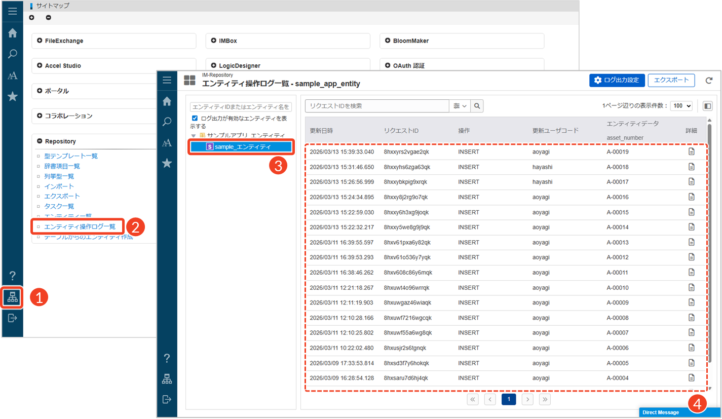 └ 「エンティティ操作ログ一覧」画面が表示されます。 - 「Repository」にある[エンティティ操作ログ一覧]をクリックします。