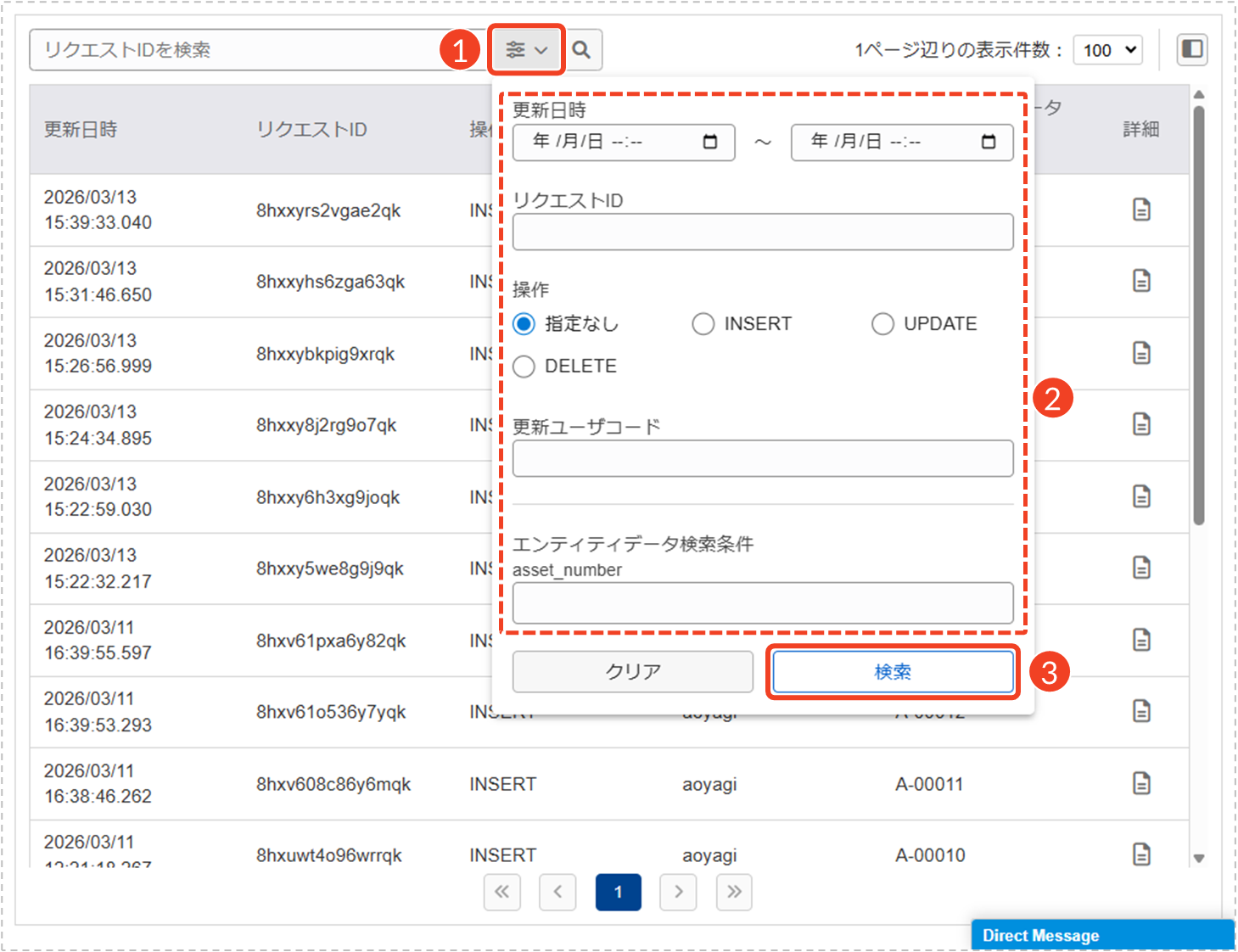 エンティティ操作ログの表示結果を検索条件で絞り込みます。