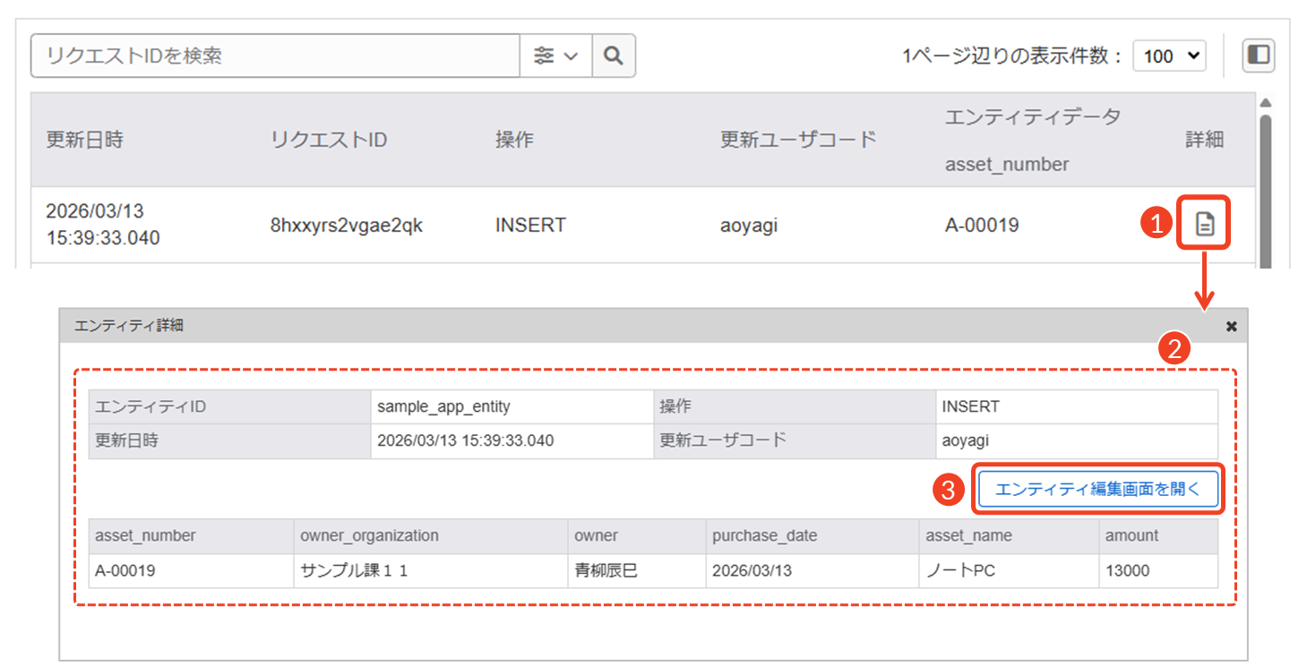 エンティティ操作ログでは、選択したエンティティに紐づく操作ログ情報が表示されます。