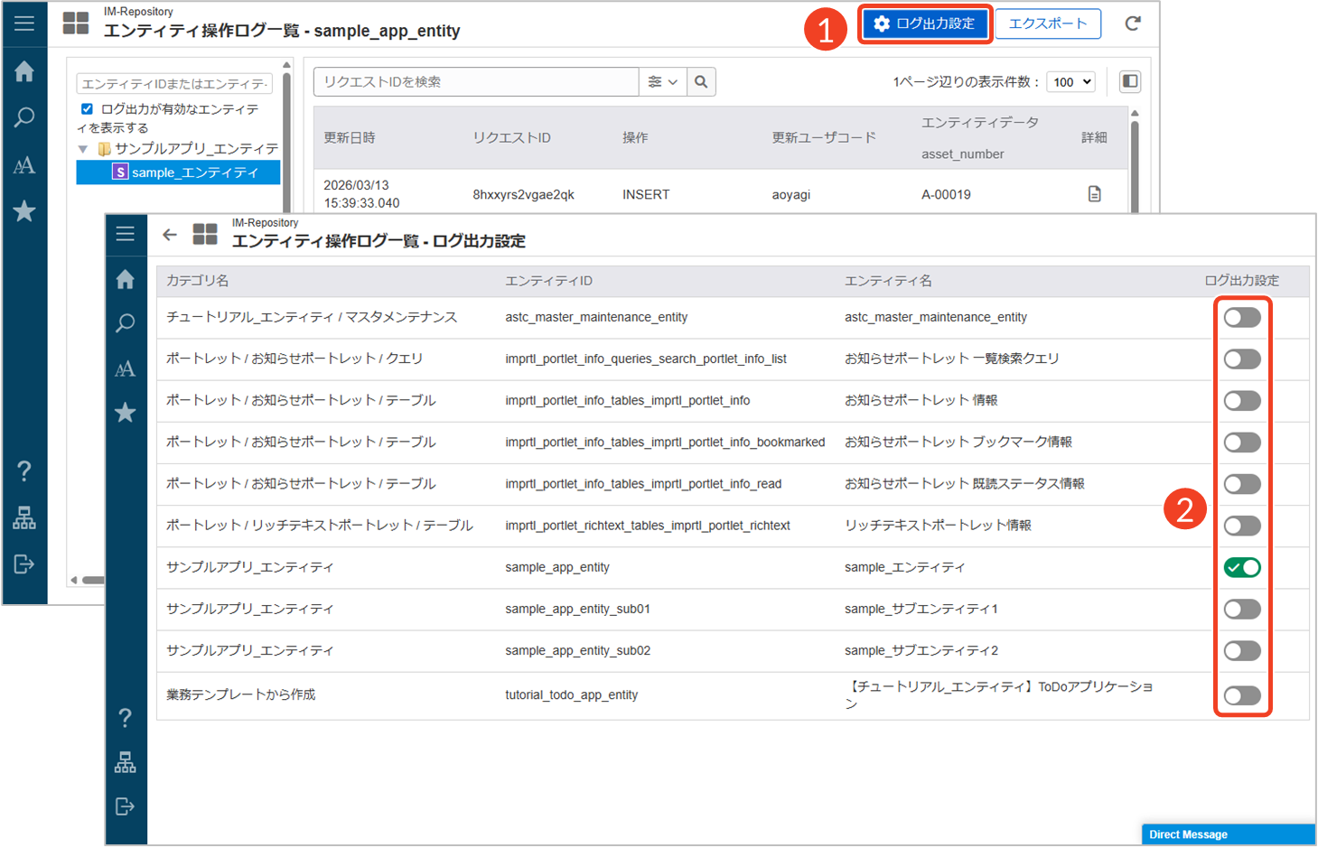 エンティティ操作ログの出力有無を変更できます。すべてのエンティティが一覧表示されるため、まとめて設定可能です。