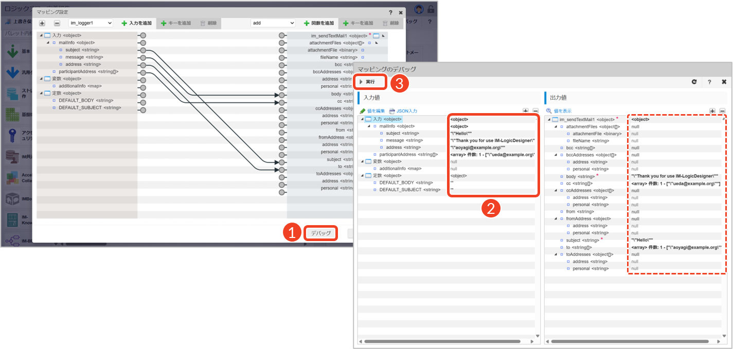 └ 「マッピングのデバッグ」画面が表示されます。 - 「入力値」の編集欄をダブルクリックします。